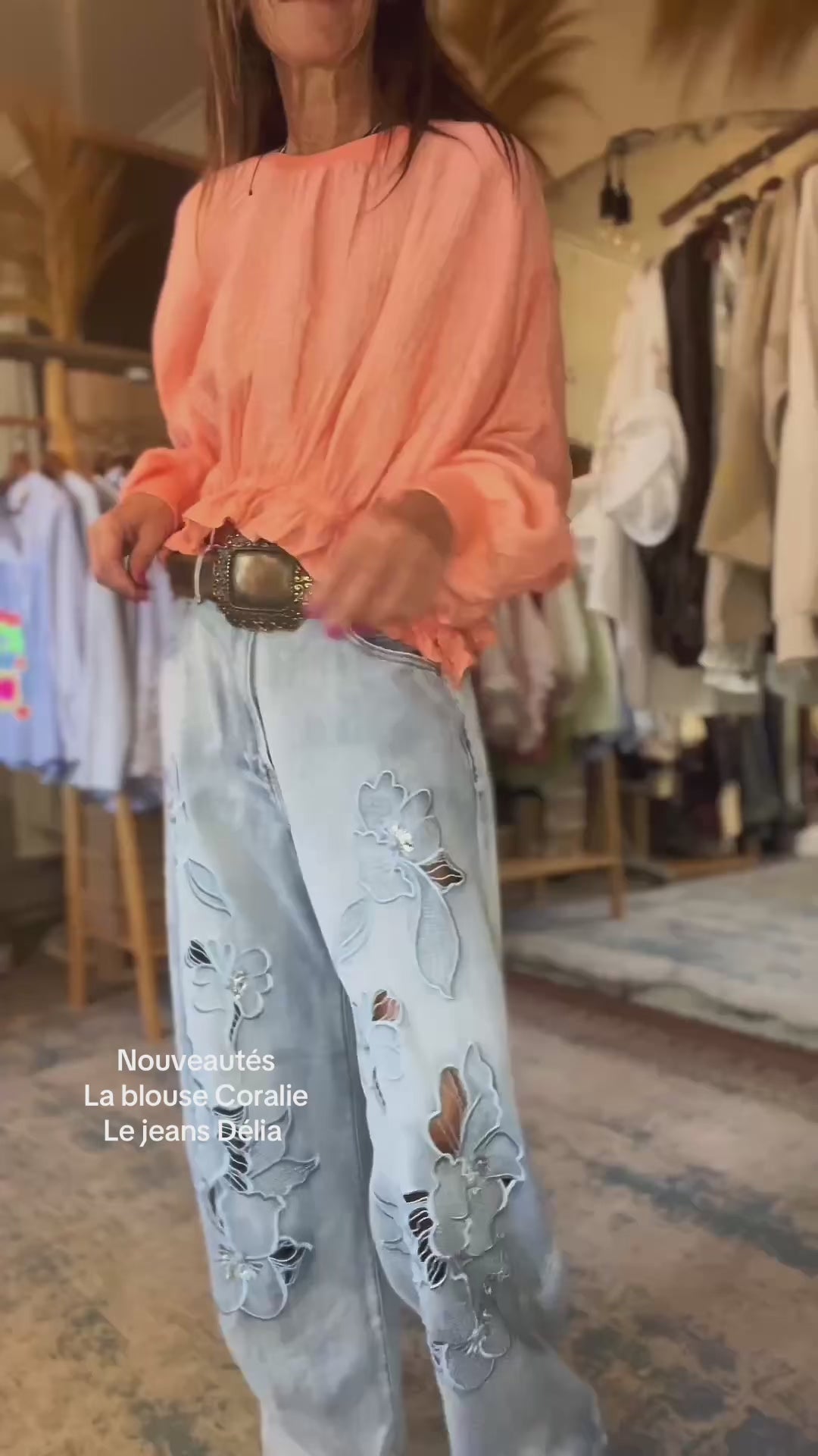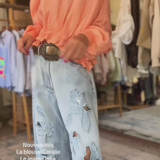 Blouse fluide corail, légère et féminine, avec manches longues bouffantes et bas élastiqué. Parfaite avec un jean taille haute pour un look chic et décontracté.